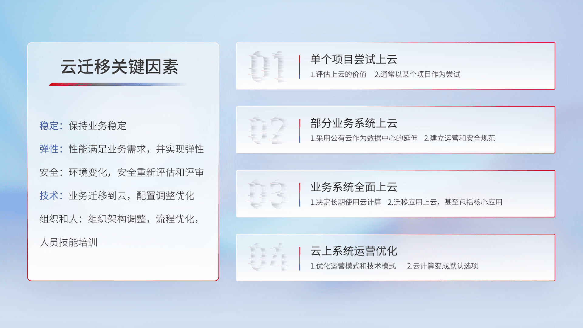 结合实际业务,,,,从规划设计、、、、云平台选型、、、云原生改造、、数据迁移、、、集成交付,,迁移全过程为客户识别最佳上云路径,,,,做好风险识别管理,,,设计网络架构、、、身份权限、、、、安全审计合规、、、、操作审计、、、日志审计、、、、监控告警策略、、多站点容灾设计等,,,,对云上基础设施进行整体规划,,,提升IT治理水平,,以满足弹性、、、、高可用、、、高性能的需求。。。。